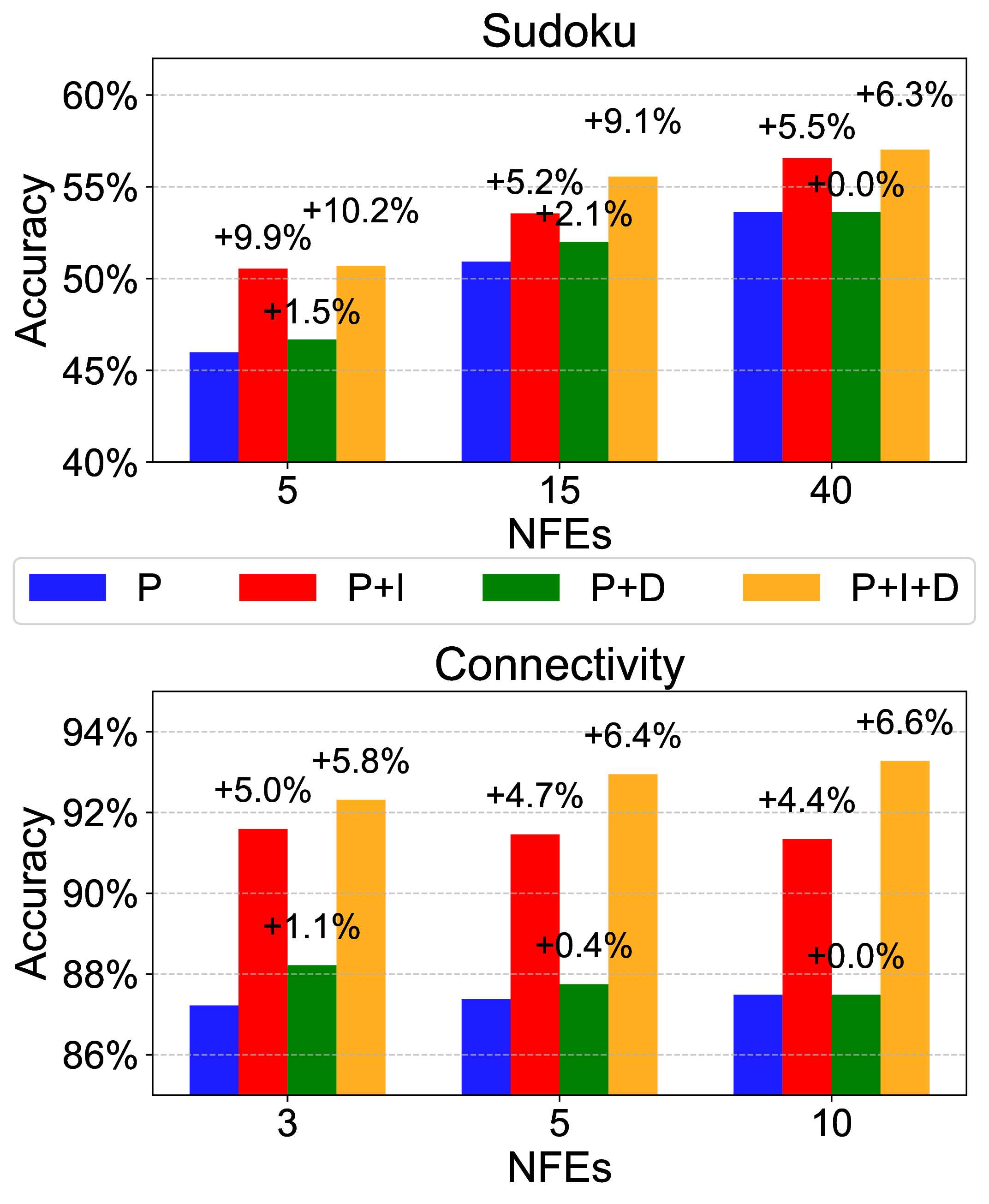 Accuracy comparison for baseline and our models across Sudoku and Connectivity tasks under different NFEs.
