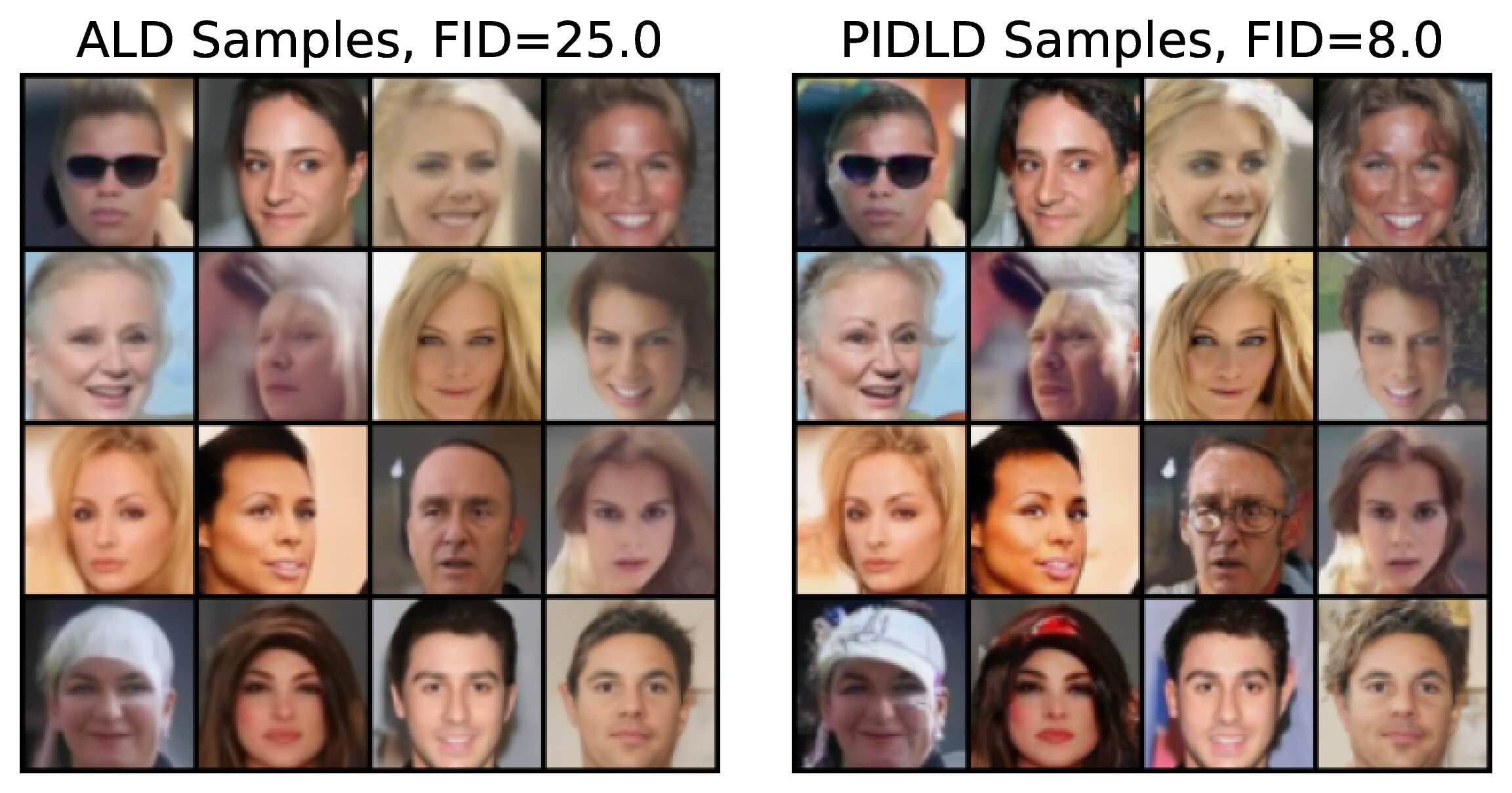 For the computer vision task, we use score-based generative model (NCSNv2) and energy-based model (IGEBM) to sample images from CIFAR10 and CelebA datasets. Our proposed PIDLD method outperforms all the baselines across different settings.