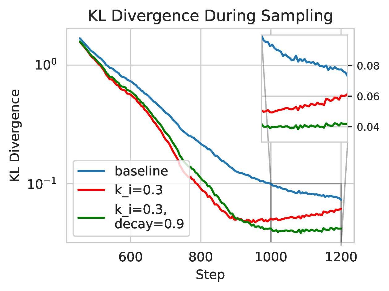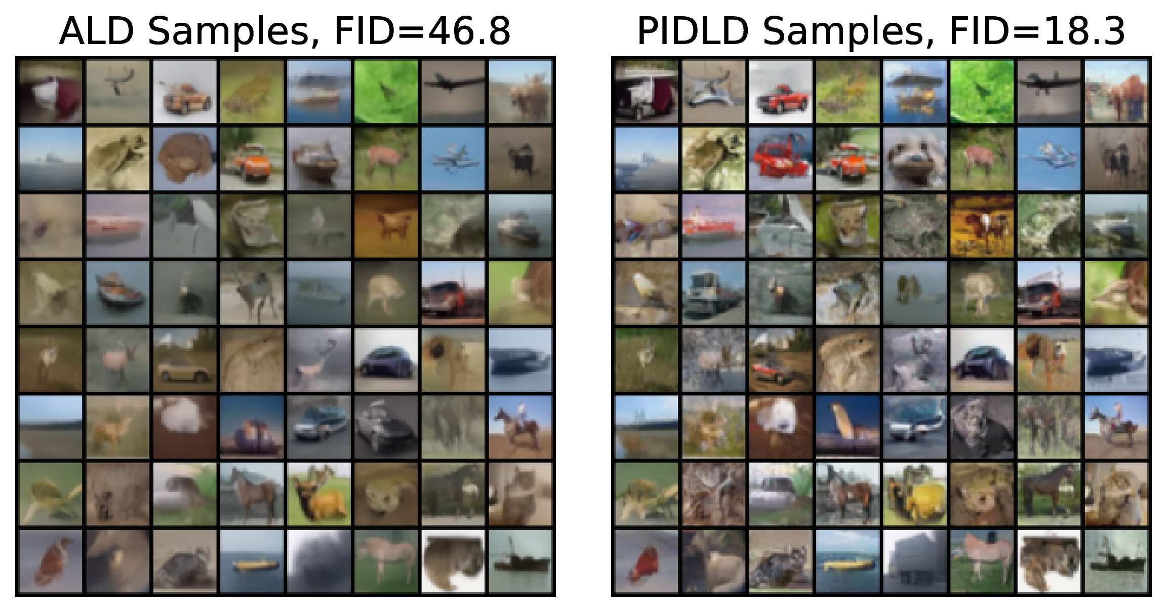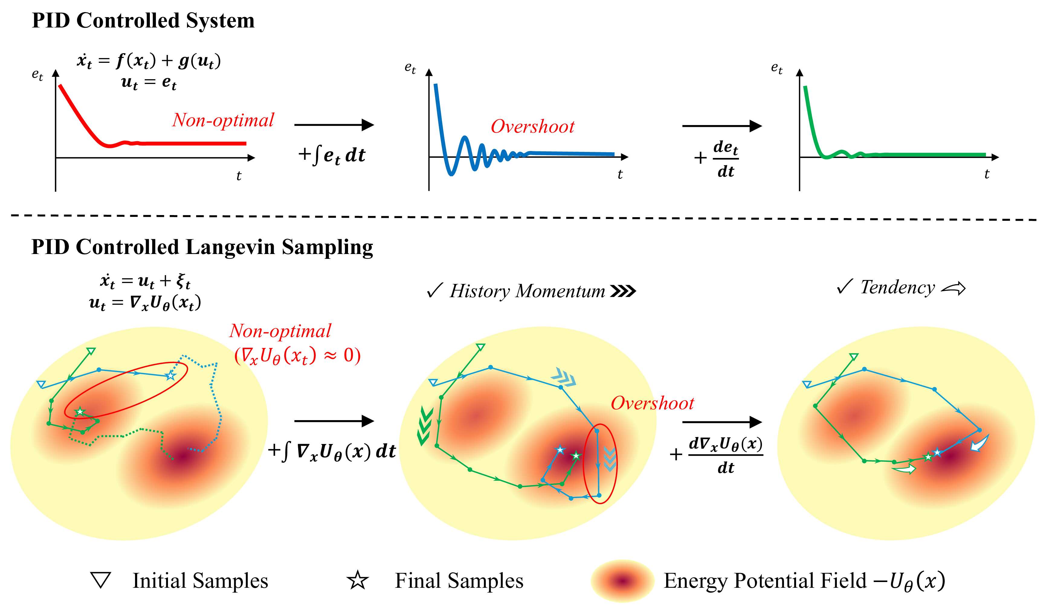 x_{t+1}=x_t+\epsilon\Big(k_p\nabla_{x}U_\theta(x_t)+\frac{k_i}{t}\sum_{s=0}^{t}\nabla_{x}U_\theta(x_s)+k_d(\nabla_{x}U_\theta(x_t)-\nabla_xU_\theta(x_{t-1}))\Big)+\sqrt{2\epsilon}\,\xi_t,